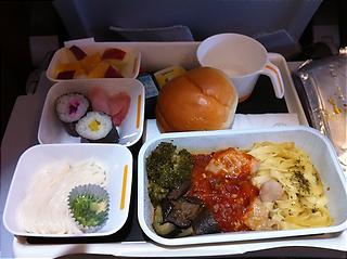 同行者はこれでもましなほうだよ。と言ってましたが。せめて日本のコンビニ弁当くらいのものは出して欲しいな。ビジネスやファーストクラスだと美味しいのかな?