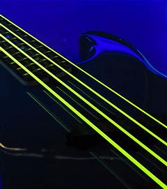 今日、レッスンで蛍光弦をはってるベースを持ってきてる方が