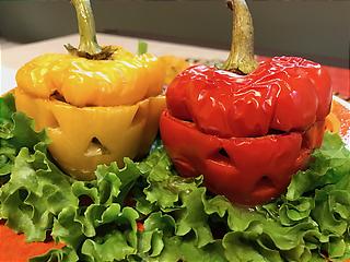 ハロウィンぽく、パプリカの肉詰めでジャック・オー・ランタンを作ってみました。