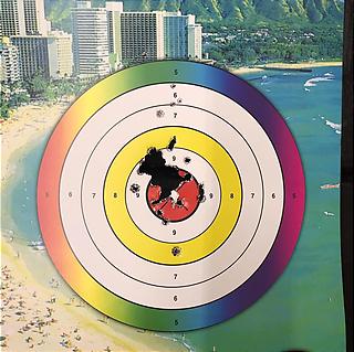 ゲームでしか拳銃を撃ったことがないけど、ファミコンの昔懐かし光線銃の要領で撃ってみたら結構真ん中に当たりました。