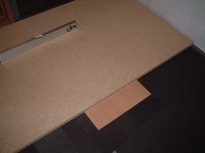 まずは水平がきちっととれていなかった床の再構築を行いました。パーティクルボードの下にベニヤの切れ端や遮音シートの切れ端なので微調整しながら水平測定器でいろんなポイントで水平になってるのを確認していきます。1時間くらいかけてほぼどのポイントでも水平になりました。 |