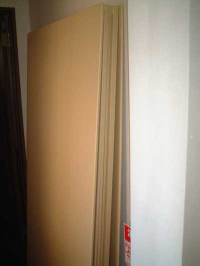 間違える人はいないと思いますが黄土色の紙がついたほうが室内側になります。裏にも紙がはられていますがざらざらしているのでクロスを貼るのに適していないのでつるつるした黄土色の面を室内にするのです。 |