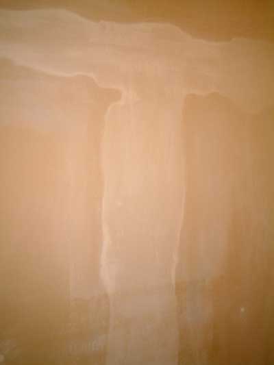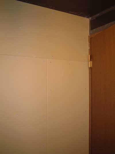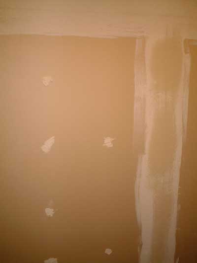 写真ではわかりにくいですが横からみるとパテが山になって盛り上がっているのです。 とりあえず継ぎ目とビス頭の穴にパテを塗ってそこを削り平らな面をつくっていくというのが基本的な工法です。 ドライウォール工法っていう工法らしいです。 これも後で知ったのですがペンキ塗り仕上げにするならまだしも、クロスを貼るならここまでしなくても良かったそうな。。。 |