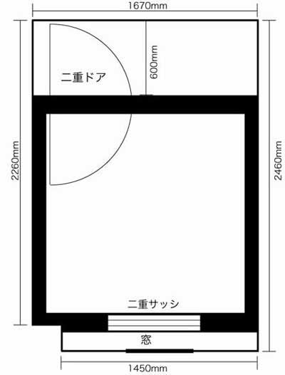 ブースに取り付ける扉は防音用ドアを買うと非常に高価なので安価なトイレドアを二重にしてドアに遮音シートをはることで防音効果のあるドアに改造する予定です。 ブースの窓側の壁と元からある壁の150mmほどの空間はウインドエアコンを設置したりするために確保しておきます。あと窓側の壁は唯一建物の外に面しているので遮音性アップのための空気層としての意味もあります。 ブース内部のサイズは1400mmの正方形に近いサイズになる予定です。 これだけのサイズがあればボーカルはもちろん、ギターなどの弦楽器でも楽々でしょう。 床は浮き床構造にするため120mmほどせりあがるので天井高はその時点で2280mmになります。 天井に防音加工をするかどうかはいまのところ未定です。建物の最上階なので上からの衝撃音などは一切ないのでもしかしたら天井はなにもしなくてもすむかもしれません。 |