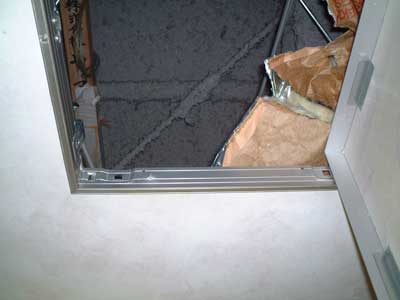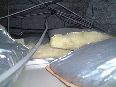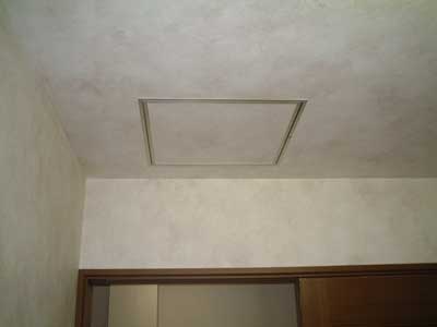 | 天井扉をあけてみると、どうやら天井は石膏ボード一枚で構成されておりそのうえにグラスウールを敷き詰めているようです。