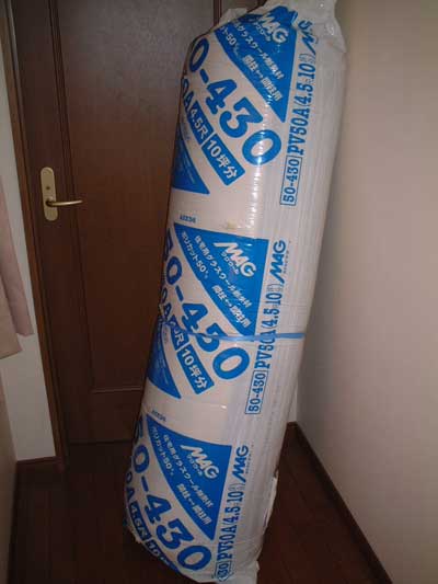吸音材はいろいろ種類がでていますが安価で手に入りやすいものといえばやはりグラスウールでしょう。 今回はグラスウールの表面をビニールで覆って施工時のちくちく感を軽減してくれるというマグのポリカットを購入。ヤフオクで「これは安い!」とおもって購入したのだが近所のコーナンのほうが少し安かった。ちょっとショックです。 |
