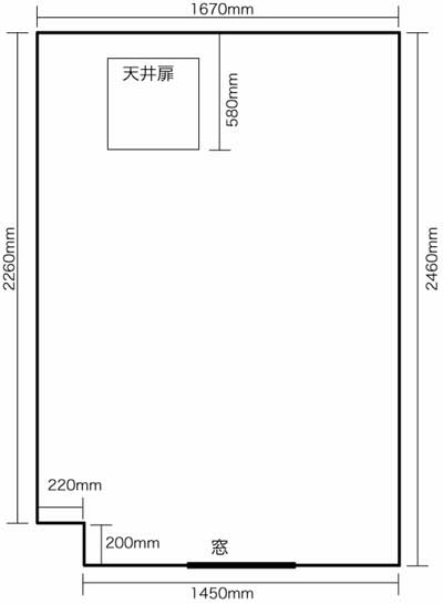 最上階なので屋根裏へのメンテナンス用扉があるのでそれをふさいでしまうことはできないのでそれを避けるようにブースを設置する必要があります。 あと元からついてある窓をふさぐとまったく風のとおらない空間になってしまい湿気がたまりカビなど発生する可能性があるので元からついてある窓にいつでもアクセスできるようにしないといけないので防音ブース自体に二重サッシをつけることで対応したいと思います。 しかしながらより防音性能を求めるなら窓類は一切なくしたほうが良いです。アルミサッシといえども完全にすき間がないわけではないですからね。 天井高は2400mmあります。 |